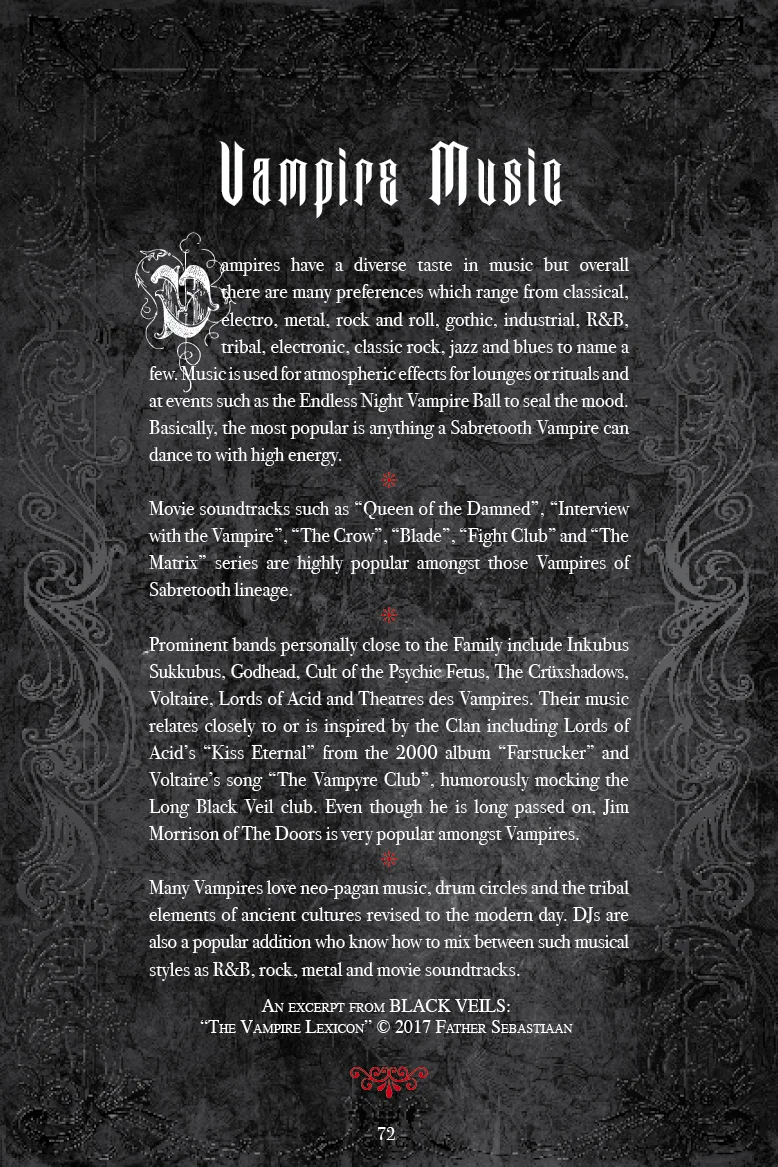 In 2013 DJ Father Coven of BloodLitRadio.com, Lady A of the VampireSocialClub.com, Chad Savage of Sinister Visions, and the resident DJs of Endless Night Vampire Ball Erik Aengel, Matt V Christ put together this list to help kick start defining Vampire Music. Special thanks to them for this suggested playlist.